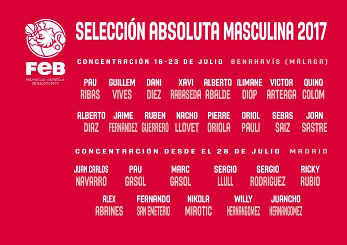 直播吧6月29日讯 西班牙国家队主教练Sergio Scariolo公布了2017年欧锦赛国家队27人名单,其中包括加索尔兄弟、埃尔南戈麦斯兄弟、卢比奥、米罗蒂奇、阿布里内斯、罗德里格斯8名NBA球员。