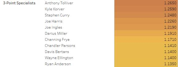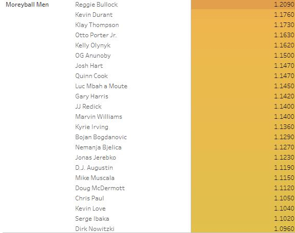 我们可以看到他们中的很多人属于莫雷组,这证明了联盟目前被三分和突破进攻统治。没有一名篮筐人进入名单,也只有一位三分组的成员出现在名单之中,库里,但我们知道库里并不能用传统限制,他是不能用常理来论的球星。