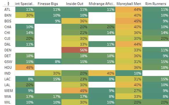 现在已经出现了许多方法来对联盟的球员类型进行划分。SethPartnow 利用雷达图来区分不同的控卫类型。最近,CrumpledJumper 用进攻方式来区分不同类型的球员,受此文的影响,我用类似于投篮分布的出手位置选择来区分不同类型的球员。具体而言,这个方法考虑到了球员在油漆区、抛投区、中距离和三分线外的出手比重。这个模型注重球员出手的位置而不是他在这些位置出手的效率。