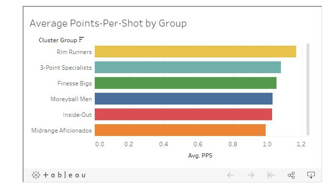 现在我们已经确定了这六种球员类型,那么是否存在某一组比其他组更加高效或是低效呢?我们可以用每组的平均得分来深度衡量这些,见下图。