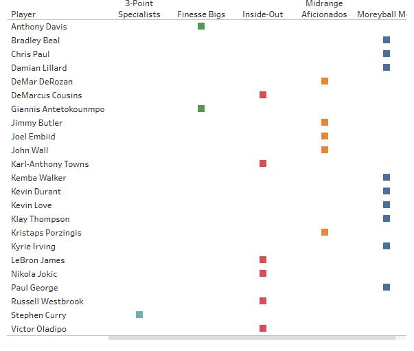 内外组:这个组别和莫雷组有着稍稍的不同,他们的出手比重最多的两个位置是油漆区(37%)和三分(31)。这个组别非常有趣,因为这里既包含了控球人,也有侧翼和大个子。例如詹姆斯和威少都是这中球员。