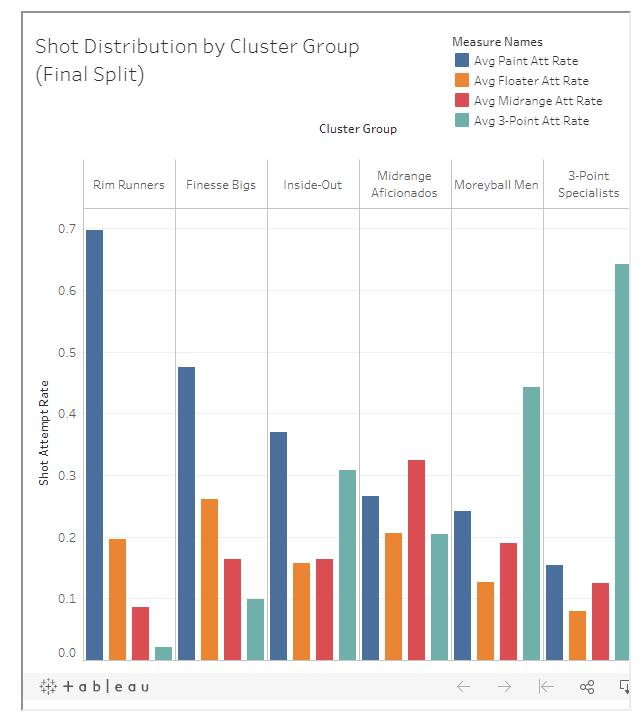 (左侧为油漆区球员,右侧为非油漆区球员,高度表示两类球员不同进攻方式的比重)