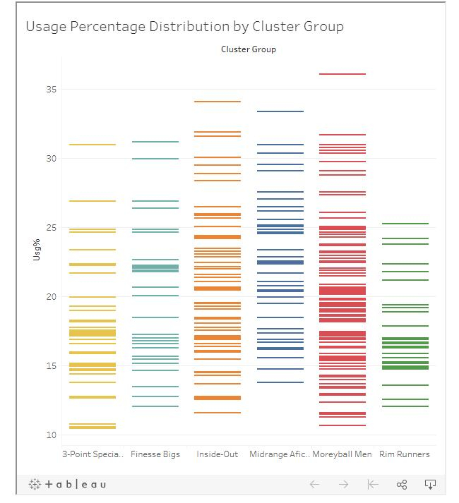 所以,我们现在可以看到这样的一种趋势:即更极端出手分布的球员类型是最高效的(只在油漆区出手或只投三分球的球员)。通常来讲这是有道理的,如果你专注于一个领域,你可以真正擅长它。但是在这么多投篮类型中三分和油漆区有可能成为球队的第一选择吗?为了知道进攻任务多少和球员类型之间是否有联系,我可以看看不同组别球员的使用率如何,使用率关系到球员占用的回合,这其中包括投篮、罚球和失误。