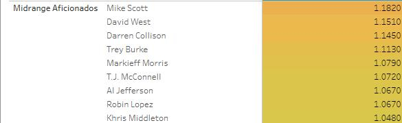 中距离组:这是一个古典的组别。这里的球员有着32%的出手是在中距离,米德尔顿和特纳都是这类球员。
