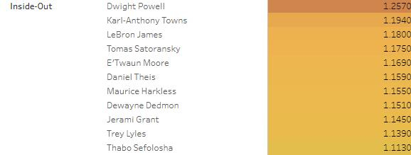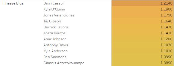 篮筐人是迄今为止效率最高的球员类型,这再次表明即使我们生活在三分球时代,油漆区的出手仍然是NBA最有价值的投篮尝试。而在篮筐人之后,三分组排在第二位,而中距离组则不出意外的是效率最低的球员类型。