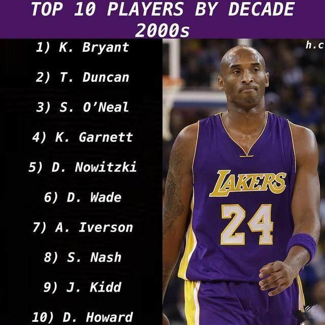 在2000年之后,手里有五个冠军的科比自然会排在第一位,虽然前三个是跟着奥尼尔拿到的,第二名的邓肯也是五个总冠军在手,而且是NBA历史上的第一大前锋,奥尼尔作为最具统治力的中锋排第三有些争议,不过以总冠军的数量来排的话还是合理的,诺维斯基,加内特都是那个时代顶级的大前锋,而且手里都有总冠军戒指。