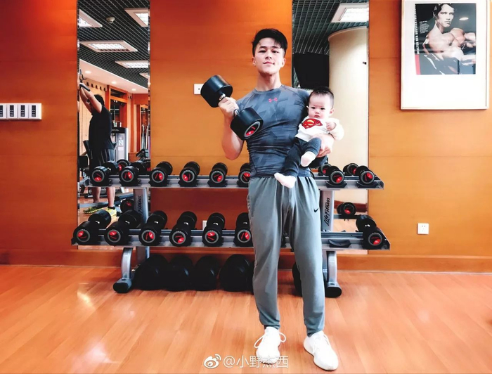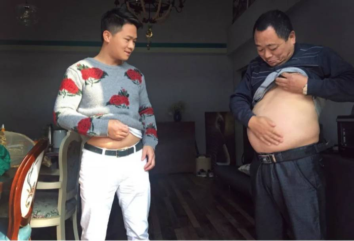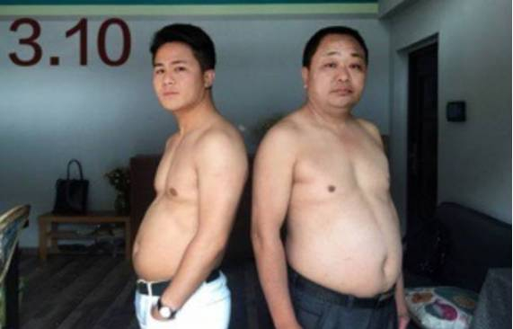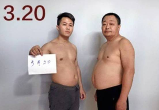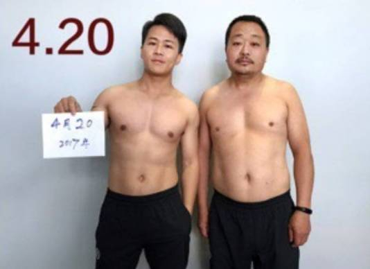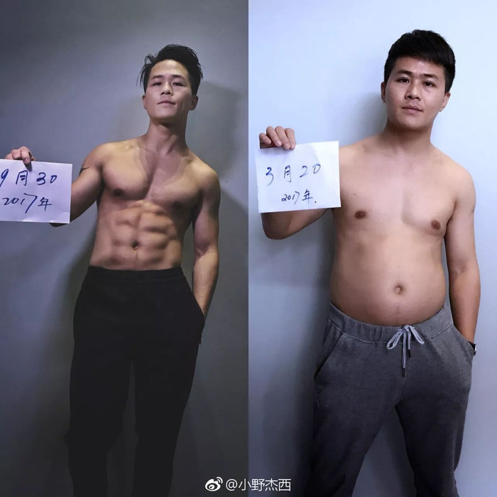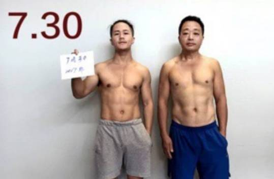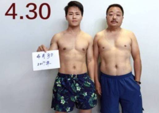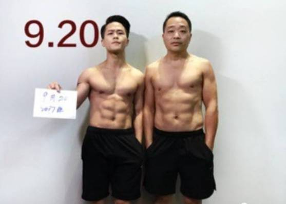 图片中年轻小伙的微博名叫@小野杰西,是一名摄影师,他跟老爸相约一起减肥,用6个月左右的时间就把啤酒肚练成了六块腹肌。