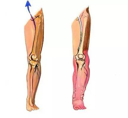 上图中,左侧是正常的腿部,蓝色箭头代表血液正常回流心肺;右侧是腿部抽筋,可以看到抽筋部位肿胀、发炎,形成静脉血栓,导致血液不能回流心肺。
