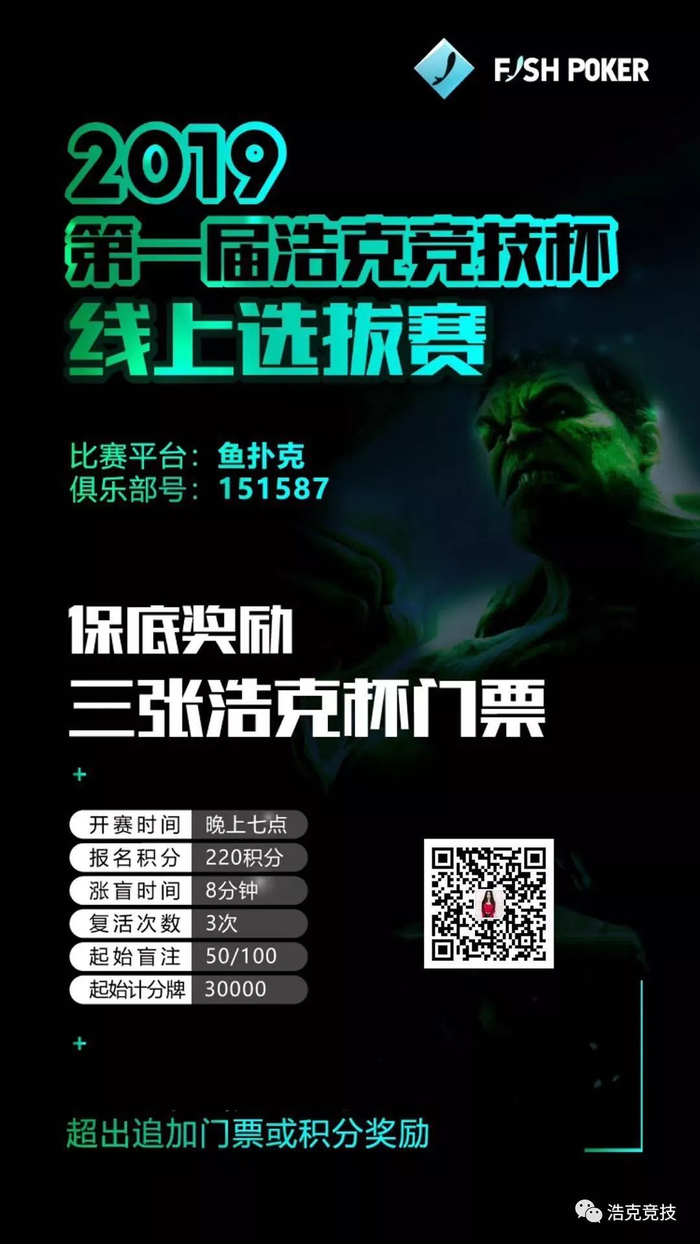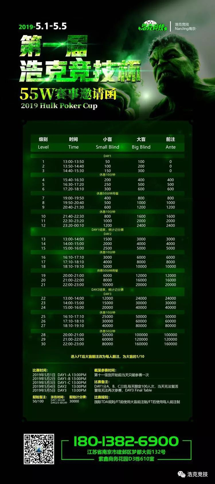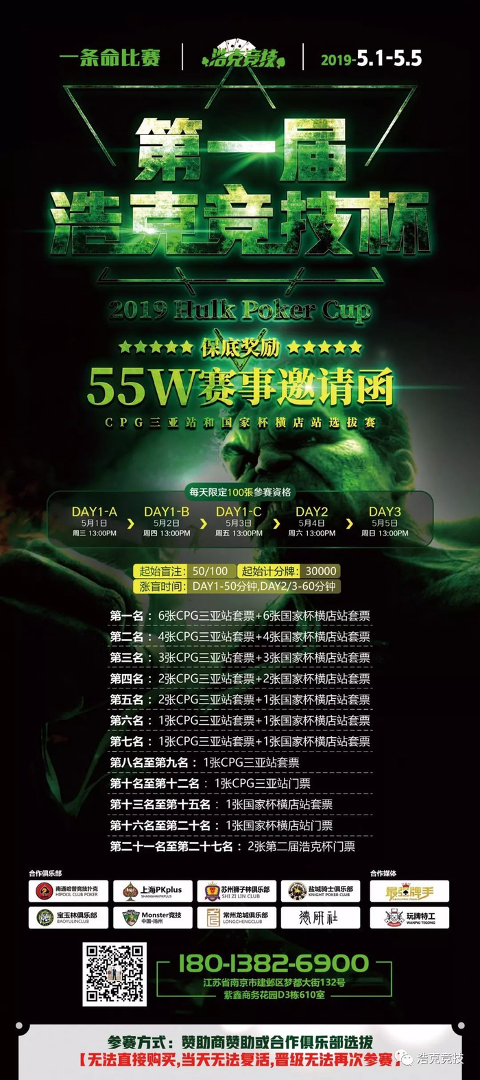 2019第一届浩克竞技杯Hulk Poker Cup在5月1日至5日在南京浩克竞技智力馆举行,本次赛事为邀请制或选拔制,无法直接购买门票,仅通过浩克俱乐部或合作俱乐部选拔赛的形式、或通过赞助商邀请的形式获得!DAY①分A、B、C三组,每组限定100个参赛资格,当天无法复活,晋级无法重进!详情见海报,微信、电话咨询!18013826900(沃德)