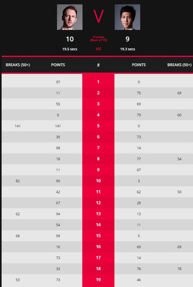 不过,经过半天休息的特鲁姆普,在第二阶段恢复了“准度王”本色,他在这个阶段打得非常有气势,致使大比分领先的塔猜亚失误频频,最终打出一波7-3的完美反击,总比分10-9逆转绝杀塔猜亚,实现了超级大逆转,拒绝了象奥沙利文那样的一轮游再次上演。