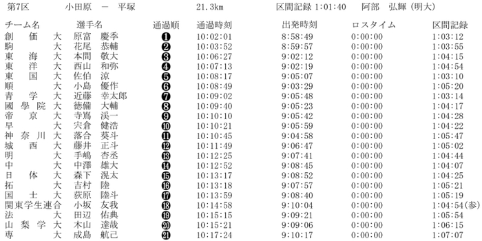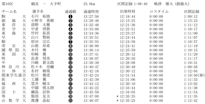 最终冠军是驹泽大学队,他们的最后一棒石川拓慎太神勇——在落后很多的情况下,实现惊天大逆转,率先撞线,捧得总冠军(10小时56分04秒)。他这一棒用时1小时09分12秒,为本区段最快。