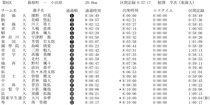 在这第二天的角逐中,青山学院大学队的总成绩最快(5小时25分33秒)。