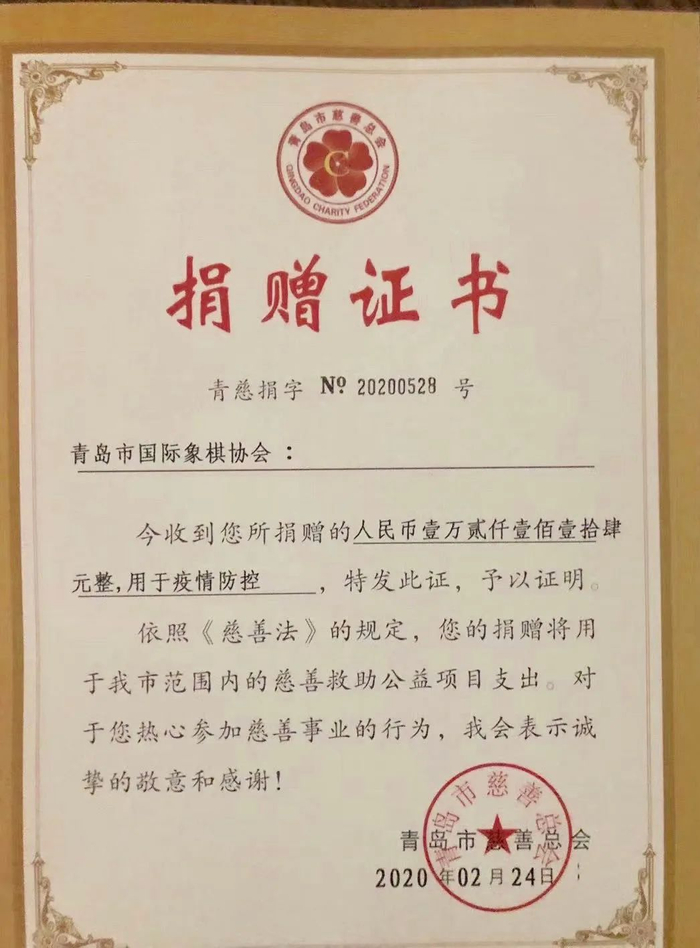 一个多月的时间里,由青岛国际象棋协会、青伟国际象棋俱乐部发起、参与的国际象棋赛事活动共10余场,累计参与人数两万余人,在青岛市国际象棋网络义赛中,参与比赛的近千名棋手将款项用于捐助疫区,一位不愿透露姓名的小棋手将自己所得的8000元比赛奖金,捐给了中国人民解放军第九七一医院。青伟国际象棋俱乐部积极响应上级部门号召,由俱乐部分部负责人、教练员、工作人员自发组成募捐,将爱心捐款悉数捐献给青岛市慈善总会,用于疫情防控。青伟国际象棋俱乐部教练张弘基举办了一次社会公益课程,通过新颖的网络授课模式,在让孩子们的水平得到进一步的提高的同时,张弘基也将社会公益课程的所有收益4500元进行捐助。
