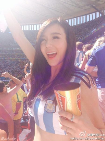 阿根廷对比利时赛后的新闻发布会场,一个对中国观众来说颇有些熟悉的曼妙身影意外出现——竟是万千宅男心目中的女神周韦彤。周韦彤是应某啤酒品牌之邀赴巴西世界杯观战来的。除了看比赛,她还肩负着另一项重任:给本场的最佳球员颁奖。在发布厅,她一袭阿根廷球衣搭配白色小热裤,面带微笑亭亭玉立,清凉的装束和姣好的面庞也吸引了不少眼球。