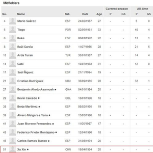 9月4日,西甲冠军马德里竞技队公布了参加欧冠联赛的名单。据欧足联官网显示,中国球员徐新进入了马竞欧冠名单的B名单。
