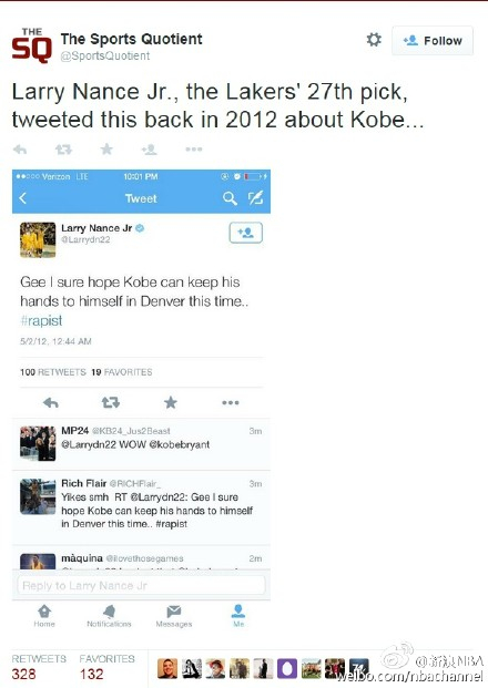 NBA选秀,一旦你被选中,尤其是热门球队,你享受着荣誉但也必须要谨慎了。湖人第27顺位选中的拉里-南斯Jr,12年在推特上骂科比…孩子…自求多福…【小伙子最后还加了个话题#强奸犯…】