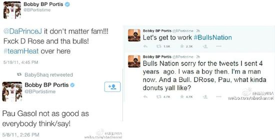 公牛选的鲍比-波蒂斯被人挖出来四年前骂过罗斯和加嫂。目前危机公关开始了,已经出来道歉了,“当年年少不懂事,罗老大和大嫂子,你们喜欢吃嘛口味的甜甜圈”……骚年,等着吧~~~~
