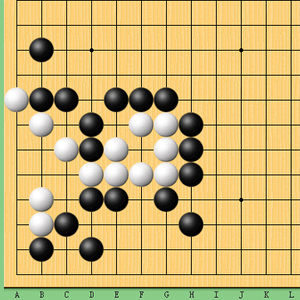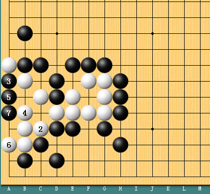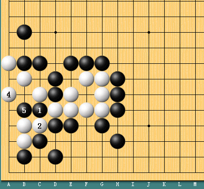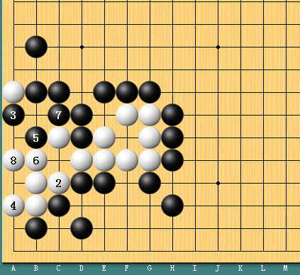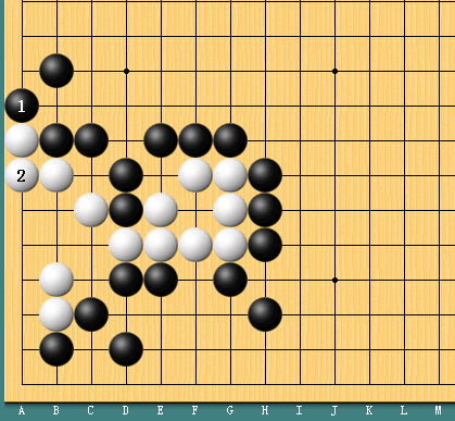 看到本题首先想到,白棋已经一只铁眼在手,黑棋只能从左边的白棋根据地入手,选点不多,黑棋如何缩小和破坏白棋的眼位是关键。
