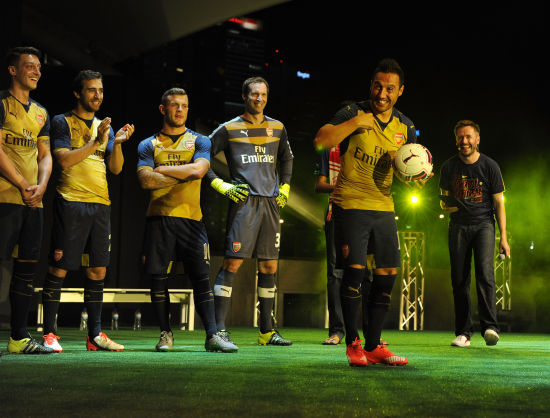 今日, 全球首屈一指的运动品牌PUMA发布阿森纳2015/16新赛季客场比赛服,通过一场名为”因枪迷更强大“的球迷见面会点燃了当晚新加坡迷人的夜空。当枪迷们现场齐声高唱阿森纳经典赞歌时,舞台上突然灯光交错,投射出的光影瞬时将一座5米高的3D塑像打造成了全新的客场比赛服。在投影结束后,阿森纳的主力球员们米克尔·阿尔特塔(MikelArteta), 赫克托·贝莱林(Héctor Bellerín), 奥利维尔·吉鲁(Olivier Giroud), 圣迪亚戈·卡索拉(Santi Cazorla), 马蒂厄·弗拉米尼(Mathieu Flamini), 梅苏特·厄齐尔(Mesut Özil),彼得·切赫(Petr Čech), 沃伊切赫·斯泽斯尼(Wojciech Szczęsny), 杰克·威尔希尔(Jack Wilshere) 和加布里埃尔(Gabriel)身着全套比赛服向现场枪迷们一一展示。