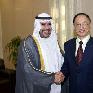 2010年广州亚运会期间,萨巴赫亲王与国家体育总局局长刘鹏握手