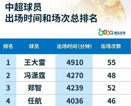 本年度中超一共有33位球员在各项赛事中出场超过3000分钟,其中本土球员20位,外援13位。只有前4位球员出场时间达到了4000分钟,其中王大雷、郑智和任航都是国家队在世界杯预选赛中的绝对主力。而冯潇霆虽然国家队出场较少,但随广州恒大淘宝在亚冠获得了足够的出场机会。