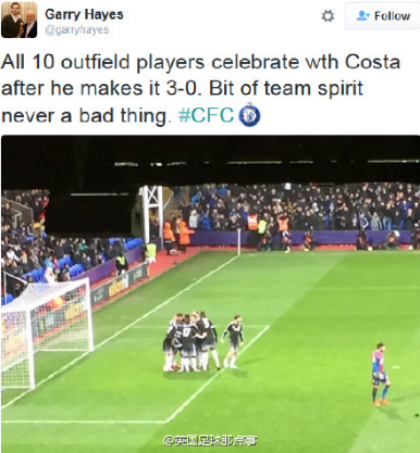 有记者拍到,科斯塔进球后,切尔西所有非门将位置的10名球员都来庆祝进球。团队精神点赞。