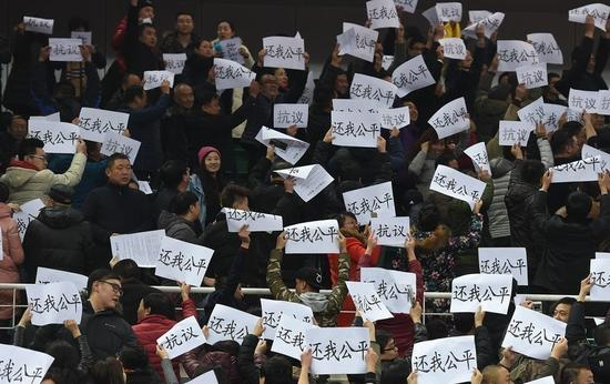 北京时间1月27日消息,CBA第34轮山西与青岛的比赛中,山西现场球迷高举“还我公平”的标语,抗议篮协对张学文的停赛处罚。