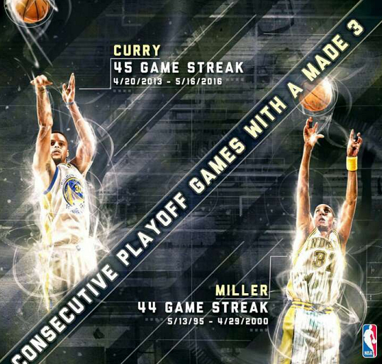 凭借这一记三分球,史蒂芬-库里完成了对老前辈雷吉-米勒的超越,连续45场比赛有三分球入账,让库里成为了NBA历史上季后赛连续命中三分球场次最多的球员。