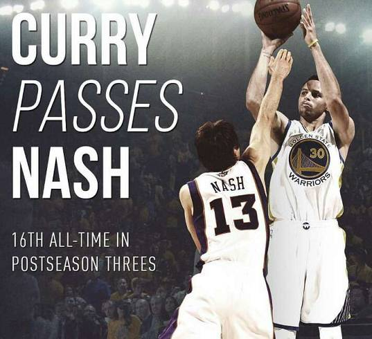 而恰恰也就是这一记三分球,让库里超越了另一位名人堂级控球后卫——史蒂夫-纳什,在季后赛个人的总三分球数排行榜上上升到了第16位。