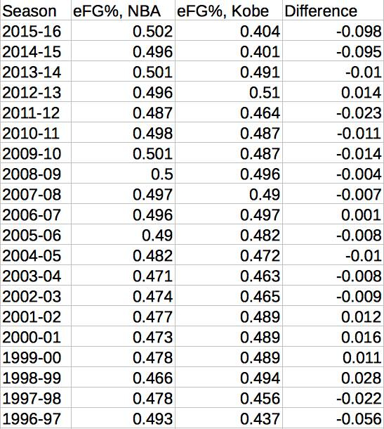 同样地,年代的不同也会造成标准的不同。拿科比来说,他有5个赛季的eFG%高于联盟平均水平,还有7个赛季的差距都不足1%: