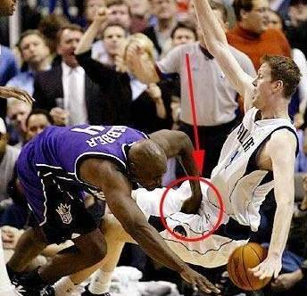 在萨克拉门托国王队与达拉斯小牛队的比赛中,国王队球星克里斯-韦伯的左勾拳正中布拉德利的裆部,后者的表情别提多痛苦。