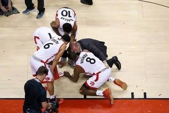 在骑士队与猛龙队比赛终场的哨声响起之后,比永博趴在地上,表情十分痛苦。
