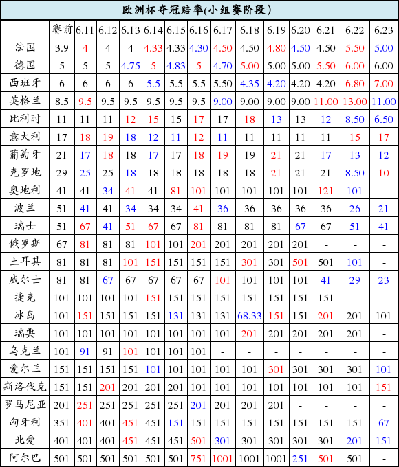 24个不眠夜,51场精彩比赛,新浪彩票将与广大球迷、彩民一同关注!24队即时夺冠赔率变化,尽在新浪彩票!我们将及时更新小组赛、淘汰赛中的夺冠赔率数据,以便广大网友参考!