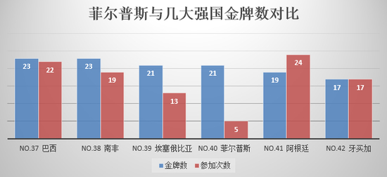 跟几大国家历史总金牌数相比,菲尔普斯的21块金牌能够和埃塞俄比亚并列排在第39位,而他达到这一成就,只用了5届奥运的时间,用时最短。