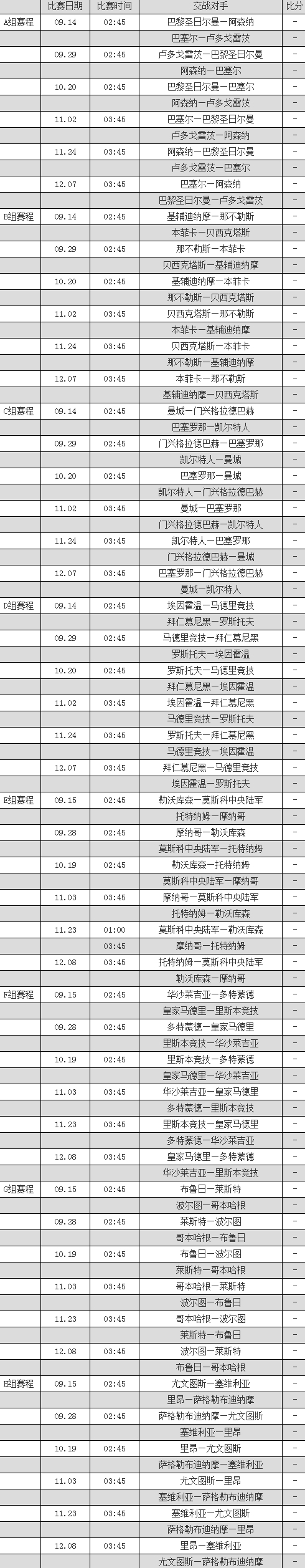 2016-17赛季欧冠小组赛详细赛程