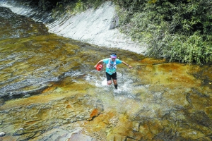 日前,2016中国·磐安中药寻宝越野公开赛在浙江磐安举行。300多名中外户外运动爱好者围绕越野跑、有序定向越野、溯溪穿越三个项目,在45公里的赛程中展开角逐。图为一名参赛选手在溯溪穿越比赛中。新华社记者 崔新钰摄