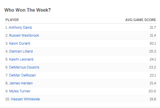 赛季开打第一周,很多球员的表现都非常好,但是谁是最好的球员?我们使用了“Game Score”这个数据来对球员进行追踪排名,它的特点是能综合加权各项数据,最终得到一个分数,以此来衡量球员的实力;而且它在样本相对较小的时候也比较准确。