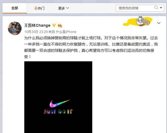 王哲林在微博上写到:为什么我必须换掉赞助商的球鞋才能上场打球。对于这个情况我非常失望。过去一年多我一直在不停的努力恢复腿伤,无论是训练、比赛还是备战里约奥运,我都需要一双合适的球鞋去保护我,真心希望各方可以考虑我们运动员的切身感受!