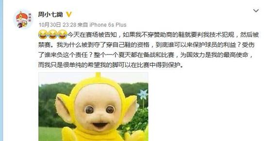 周琦在微博上写到:今天在赛场被告知,如果我不穿赞助商的鞋就要判我技术犯规,然后被禁赛。我为什么被剥夺了穿自己鞋的资格,到底谁可以来保护球员的利益?受伤了谁来负这个责任?整个一个夏天都在备战和比赛,为国效力是我的最高使命,而我只是很单纯的希望我的脚可以在比赛中得到保护。