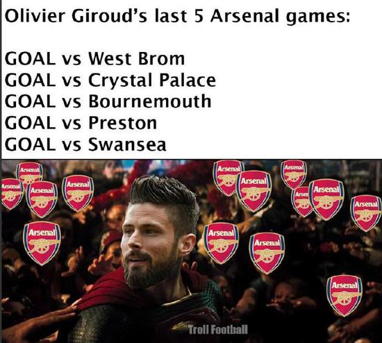 阿森纳过去各项赛事5场比赛,吉鲁均取得了进球,其中3球还是最后时刻的绝杀。法国人为阿森纳首发的近9场比赛均有进球,一共打进11粒进球。