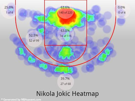 在他变幻莫测的传球之下的,是“他是一个高大攻击手”的本质。约基奇能投中距离,有一手三分,同时还是一架凶悍的低位绞肉机,他有大量的出手来自于禁区,能依仗着自己的身高与体重在篮下打出非常高效的篮球。