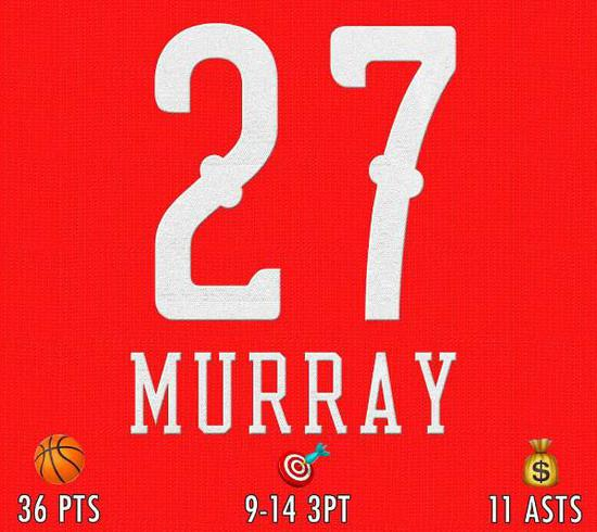 上半场比赛穆雷的表现中规中矩,开场的四次出手都没能命中,只得到9分。然而到了下半场穆雷大发神威,一人独取27分。值得一提的是,穆雷的球衣号码也是27号。