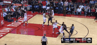 在比赛最后1分02秒,火箭以105-110落后5分,在这时,火箭超六路易斯-威廉姆斯接詹姆斯-哈登助攻,骗起了迈尔斯-特纳,完成了一次打4分(罚球不中),将比分追到108-110。