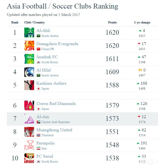 近日,著名足球数据统计网站《footballdatabase》今日发布了最新一期世界足球俱乐部排行榜。本期榜单中,之前排名亚洲第一的广州恒大积分下降到1620分,被沙特阿赫利队追平,并列排在第一位。其他中国俱乐部中,上港上升至亚洲第23位,苏宁排在亚洲第57位,国安、鲁能、申花、富力也排到了亚洲前100行列。