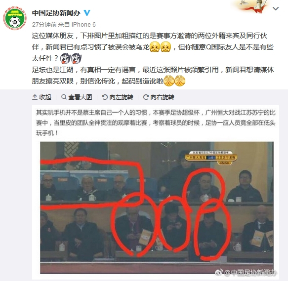 日前有媒体称,在超级杯比赛当中,有足协官员不看比赛,都在低头玩手机。今日,中国足协新闻办辟谣称,看手机的观众并非中国足协人士,而是赛事方邀请的外籍来宾和同行伙伴。