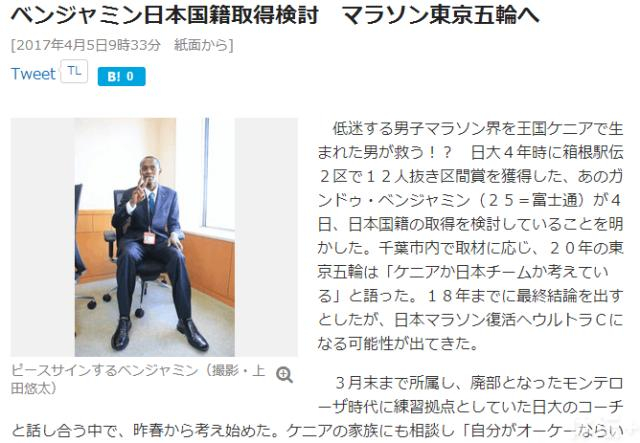 北京时间4月5日,据日媒报道,日本马拉松界最近正在为本国低迷的马拉松现状担忧,但他们正在讨论一个惊人计划——归化在日本生活多年的25岁肯尼亚籍马拉松好手本杰明。目前从本杰明的自身条件看,按照日本的国籍法他可以在近两年内完成归化的手续,但国际田联今年年初刚出台了收紧更改国籍的政策,本杰明要想代表日本参加年东京奥运会将遇到不小的难度。不过日媒还是乐观地展望称,一旦本杰明能顺利归化,日本将有实力在东京奥运会上竞争男子马拉松奖牌。