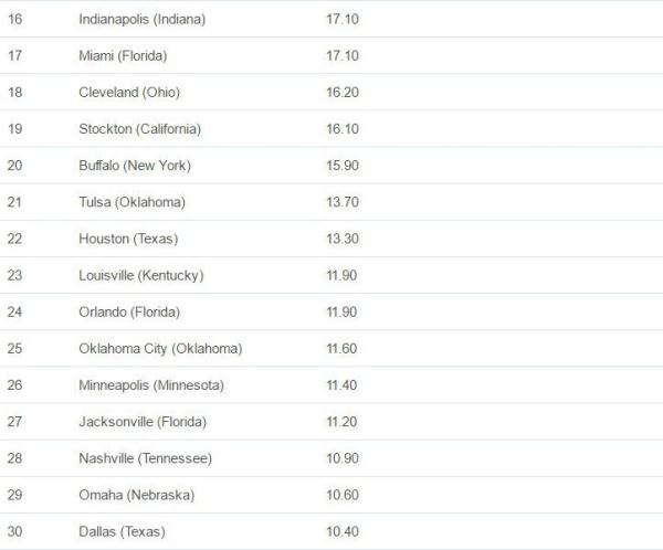 今年2月份,美国媒体《Worldatlas》公布美国最危险的30个城市,这个排名的基础是FBI(联邦调查局)提供的凶杀率(每10万人有多少人被杀):