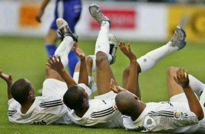 C罗这个即兴庆祝,似乎是大鹏展翅之后没有站稳,顺势倒地之后"空中蹬车"。需要指出的是,C罗这个动作,有别于2005-06赛季皇马的巴西三杰挑衅式庆祝。11年前的西甲,皇马3-0大胜阿拉维斯。罗纳尔多进球之后,与罗比尼奥、卡洛斯一起倒在地上,做出四脚朝天的姿势模仿蟑螂。阿拉维斯认为,大罗、罗比尼奥、卡洛斯的庆祝是对自己的侮辱,并表达强烈不满。后来,3名巴西球星向对方道歉。