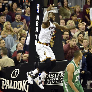北京时间看5月24日,克利夫兰骑士主场112-99击败波士顿凯尔特人,将系列赛总比分改写为3-1。勒布朗-詹姆斯全场27投15中,得到34分5个篮板和6次助攻,而在所有的进球当中,最精彩的一球,当属他在终场前8分43秒的底线突破暴扣。
