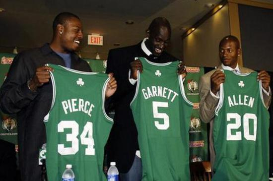 2007年夏天,彼时的加内特已经31岁,常规赛场均22.4分12.8篮板,顶级内线的水平,在森林狼苦守12年无果,始终不能触碰到荣誉之巅。眼看生涯要走下坡路,KG决定放手一搏,加盟凯尔特人,与皮尔斯,雷阿伦组成绿军三巨头!三巨头组建第一年便夺得了总冠军,在今后几年一直支配着东部赛区!